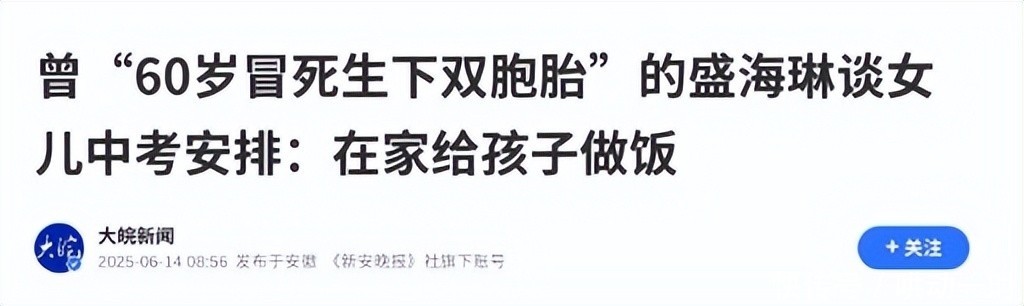 参考资料:大皖新闻《曾“60岁冒死生下双胞胎”的盛海琳谈女儿中考安排:在家给孩子做饭》